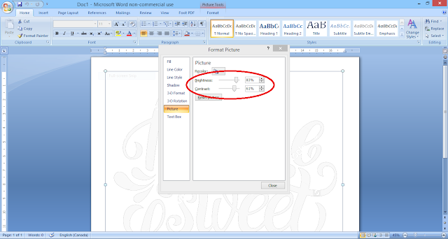Crop any watermarks or borders you don't want and insert your template into Word and stretch it to size, remembering to not get too close to the edge. If you lose quality (lines become pixilated or blurry), you'll need to find a design in a larger resolution. Right click the image and find "Format Picture". You'll want to adjust the Brightness and Contrast until just the outline is left. You can ignore this step if your template already has an outline. Save the Word document as a PDF.
