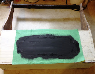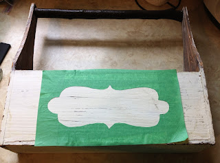 1. Paint with you chalkboard paint and wait for it to dry. I waited until it was tacky for this particular item because I didn't want the tape to sit for too long and peel paint with removal. The tape did peel off some of the old paint on the caddy anyway.
